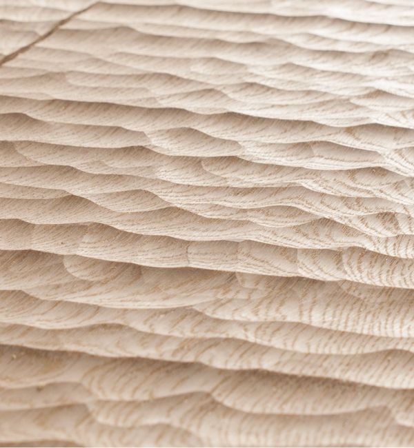 Die Oberfläche der Paneele ist in einer wellenförmigen 3D-Textur unregelmäßig gehobelt. Dieser Prozess führt zu einer organischen, dynamischen Struktur, die dem Material Bewegung und Tiefe verleiht.