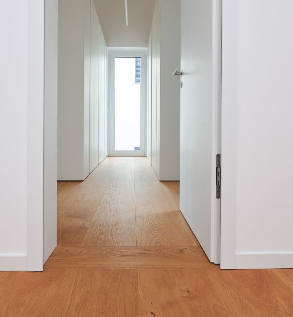 Les lames de longueur de pièce sont généreuses en termes de format, aussi longues que la pièce dans laquelle elles sont posées. Les lames longues et uniformes créent une sensation d'espace et de tranquillité visuelle. Elles sont fabriquées par nos soins selon des intervalles de 50 cm. La pose avec un joint visible ou un joint d'ombre assure une ligne claire dans nos planchers en lames.